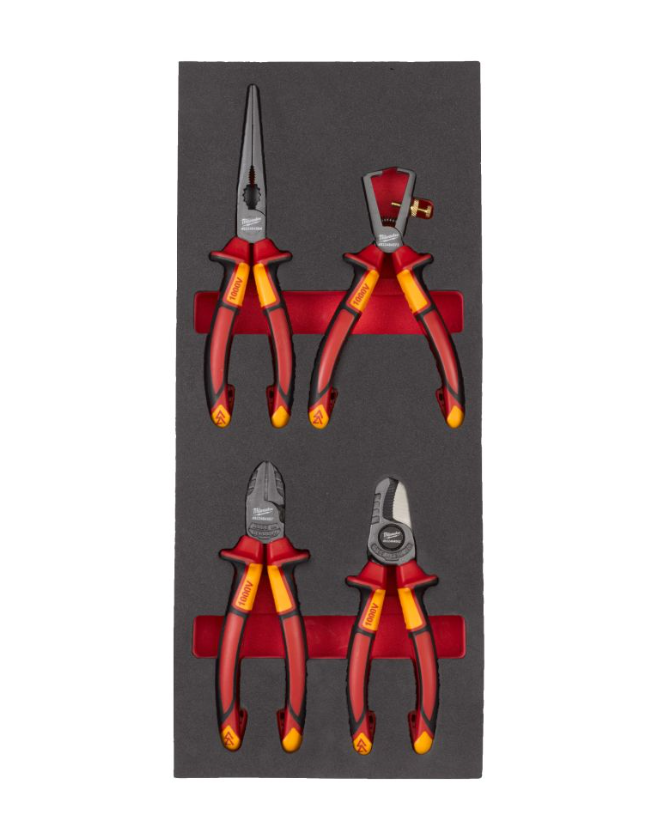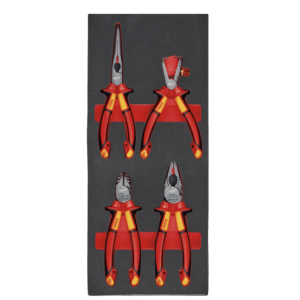 Inclui: Alicate de Corte Diagonal VDE 160mm + Alicate de Pontas Compridas Redondas VDE 205mm + Alicate de Corte VDE 160mm + Alicate Descarnador de 160mm