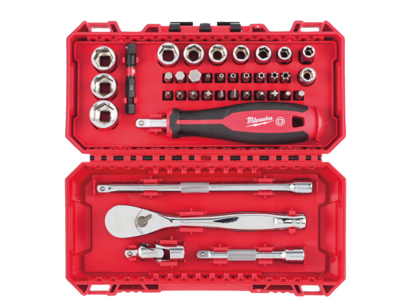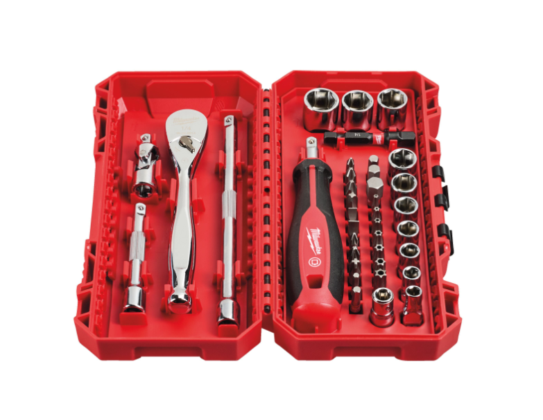 Inclui: Roquete de 1/4″ + Punho Tri-Lobe Porta Pontas 1/4″ + Chaves de Caixa: 5,5 / 6 / 7 / 8 / 9 / 10 / 11 / 12 / 13 / 14 + Extensões: 76mm / 152mm + Pontas de Impacto Shockwave: SL4,5 / SL5,5 / SL6,5 / PH1 / PH2 / PH3 / PZ1 / PZ2 / PZ3 Hex. 3 / Hex. 4 / Hex. 5 / Hex. 6 / Hex. 8 / TX B010 / TX B015 / TX B020 / TX B025 / TX B027 / TX B030 / TX B040 + Adaptador para Chaves de Caixa 1/4″ Quad. – 1/4″ Hex.