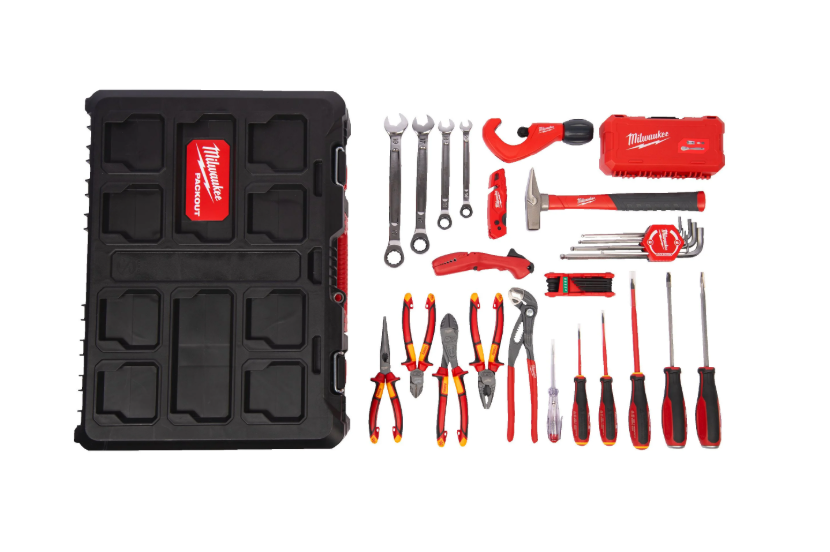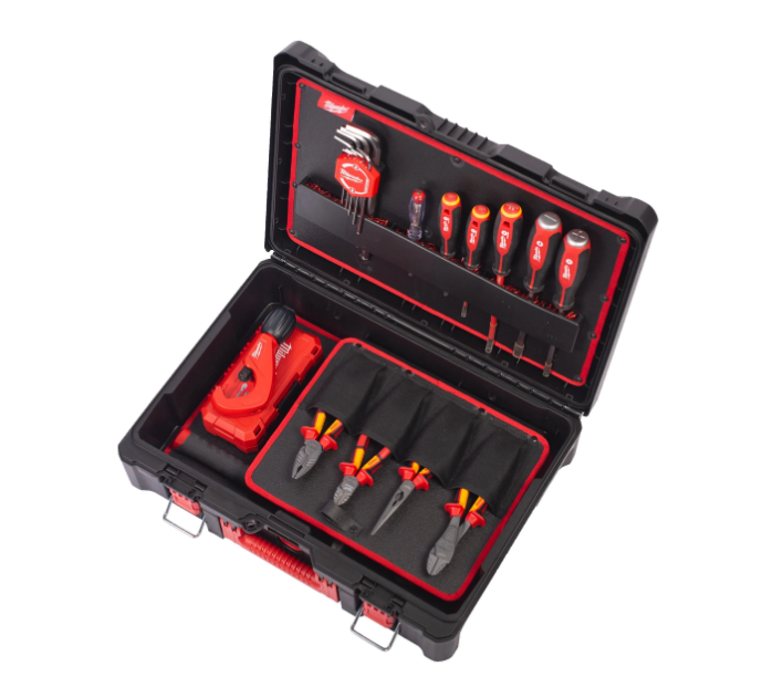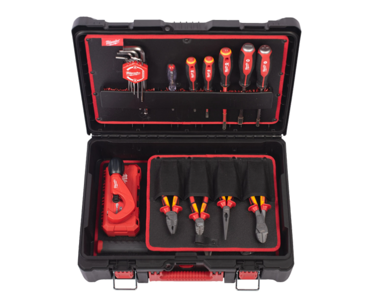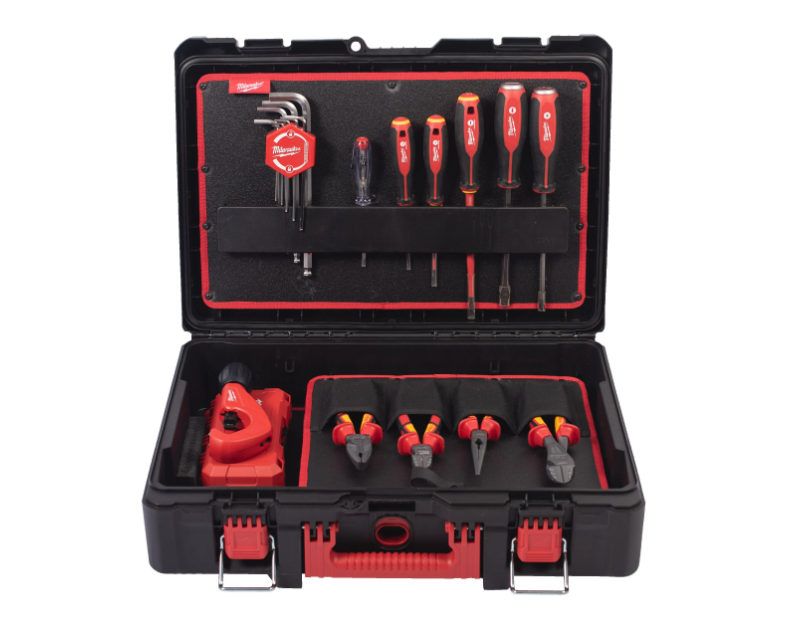 Inclui: Alicate de corte diagonal VDE 160mm + Alicate de corte diagonal reforçado VDE 200mm + Alicate de pontas longas VDE 205mm + Alicate universal VDE 180mm + Alicate de cremalheira ajustável 250mm + Descarnador multifunções 4 em 1 + Chave de fendas VDE Tri-Lobe 0.4×2.5×75 + Chave de fendas VDE Tri-Lobe 0.6×3.5×100 + Chave de fendas VDE Tri-Lobe 1.2×6.5×150 + Chave de fendas VDE Tri-Lobe Demolition + Testador 0.5x3x65 + Chave de boca combinada Maxbite™ 10mm + Chave de boca combinada Maxbite™ 13mm + Chave de boca combinada Maxbite™ 17mm + Chave de boca combinada Maxbite™ 19mm + Martelo de engenheiro em fibra de vidro 300g + Conjunto de roquete e chaves de caixa 1/4″ – 38 peças + X-ato Fastback Flip com armazenamento de lâminas + Conjunto de 9 chaves hexagonais + Conjunto de 8 chaves Torx dobráveis + Cortador de tubos 3,2–42 mm