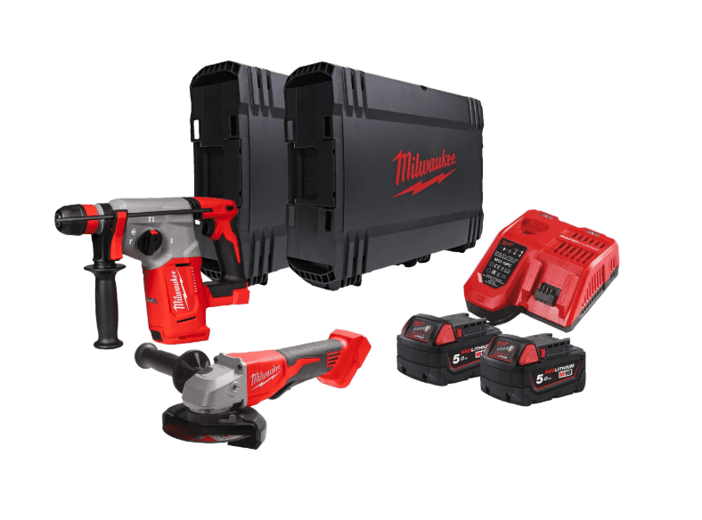 Inclui: Martelo Combinado SDS-Plus M18 (M18 BLHX) + Rebarbadora de Acabamentos 125mm com Interruptor de Alavanca M18 (M18 BLSAG125XPD) + 2 Baterias 5.0 ah M18 + Carregador Rápido Multivoltagem M12-M18 + Box