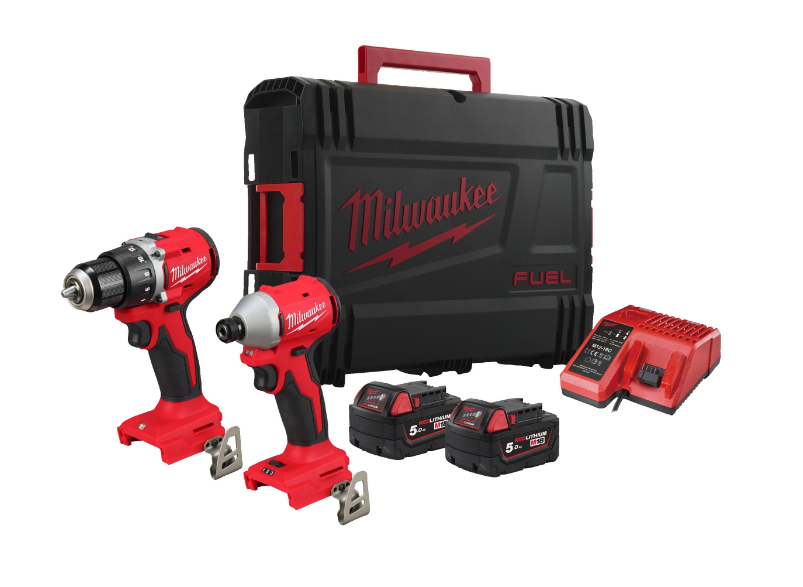 INCLUI: Aparafusadora de Impacto Compacto sem Escovas ¼” Hex M18 (M18 BLIDRC) + Berbequim Aparafusador Compacto sem Escovas M18 (M18 BLDDRC) + 2 Baterias 5.0 ah M18 + Carregador Multivoltagem M12-M18 + Box