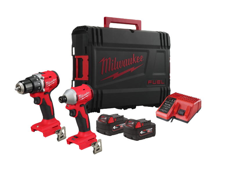 INCLUI: Aparafusadora de Impacto Compacto sem Escovas ¼” Hex M18 (M18 BLIDRC) + Berbequim Aparafusador Compacto sem Escovas M18 (M18 BLDDRC) + 2 Baterias 4.0 ah M18 + Carregador Multivoltagem M12-M18 + Box