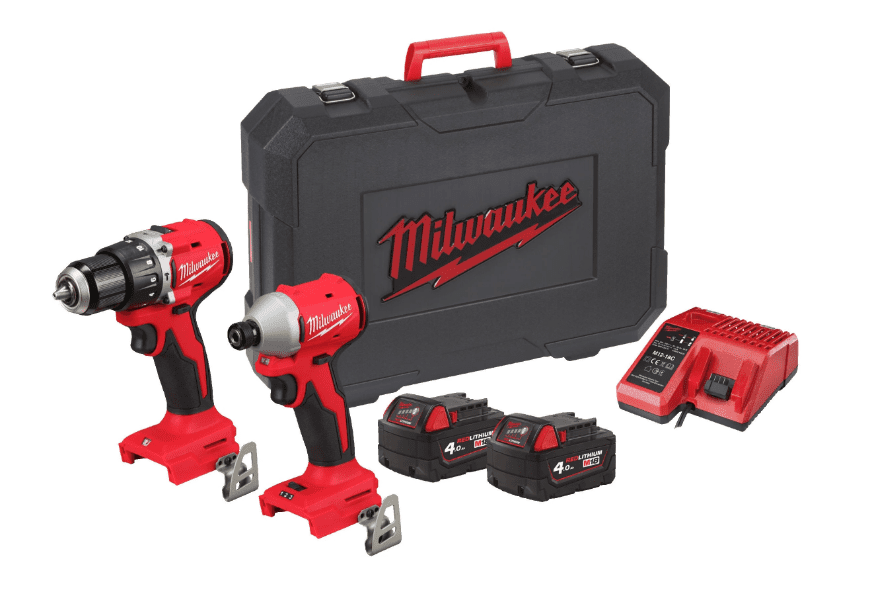INCLUI: Aparafusadora de Impacto Compacto sem Escovas ¼” Hex M18 (M18 BLIDRC) + Berbequim com Percussão Compacto sem Escovas M18 (M18 BLPDRC) + 2 Baterias 4.0 ah M18 + Carregador Multivoltagem M12-M18 + Box