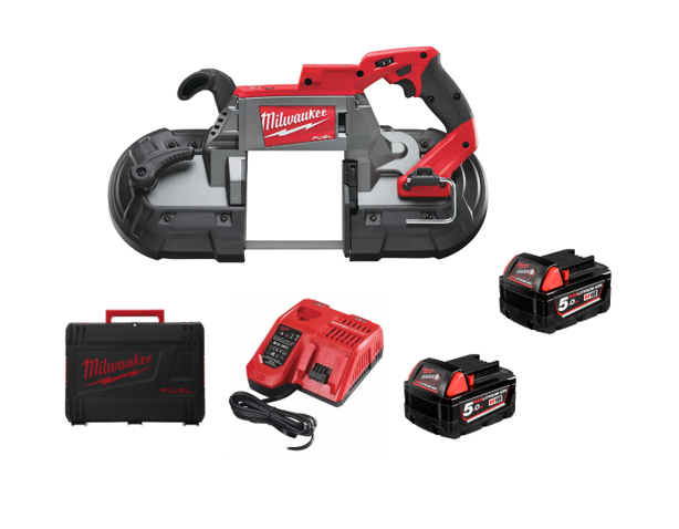 INCLUI: Serra de Fita + 2 Baterias 5.0ah M18 + Carregador Rápido Multivoltagem M12-M18 + Box