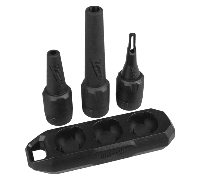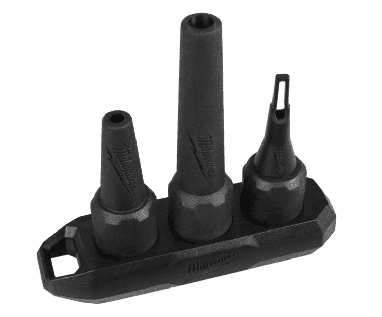 - Inclui três bicos (6 mm, 10 mm e um inflador) montados em um suporte magnético.